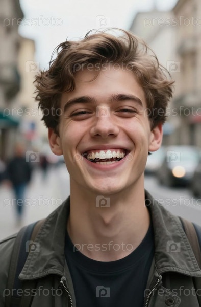 Молодой человек стоит на улице с большой улыбкой на лице.У него ярко белые зубы и он выглядит счастливым, когда гуляет среди многих людей в течение дня Генеративный ИИ