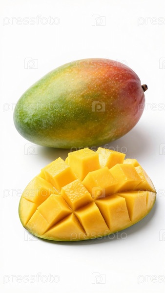 Целый манго сидит рядом с разрезанным на кубики пополам манго. Манго имеет зеленую и красную кожуру. Настройка яркая с простым белым фоном Generative AI