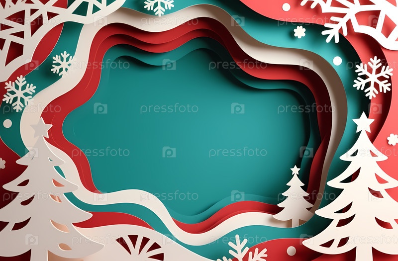 Этот дизайн имеет слойный фон в красном и зеленом цветах для новогодних и рождественских открыток.Он включает декоративные элементы, такие как снежинки и деревья, подходящие для праздничных тем Generative AI