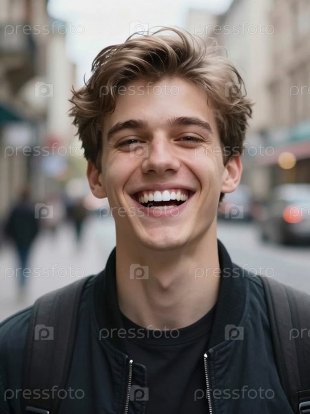Молодой человек стоит на оживленной улице, широко улыбается. он показывает ярко белые зубы и выглядит счастливым в то время как люди проходят мимо на заднем плане генеративный ИИ