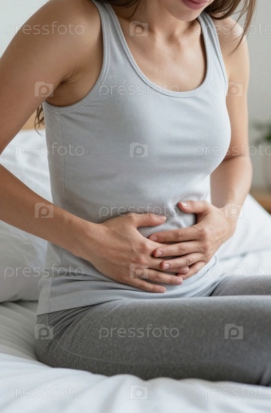 Женщина сидит на кровати, держась за живот. Она выглядит некомфортно из-за менструальных болей и метеоризма. Ее выражение лица показывает признаки дистресса от мышечной боли Generative AI