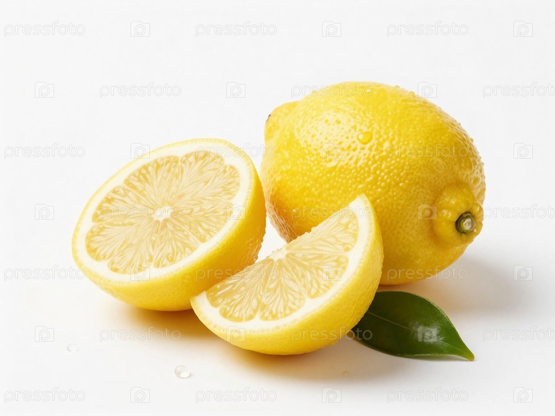 Желтый лимон сидит на белом фоне. Он целый с двумя кусочками, расположенными рядом. Зеленый лист добавляет контраст яркому плоду. Свет отражается от его поверхности Generative AI