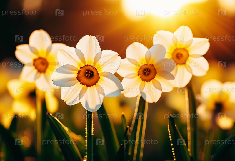 Цветы нарцисса стоят высоко в клумбе, когда солнечный свет ярко светит на заднем плане.Сцена запечатлевает цвета и красоту весны в садовой обстановке Generative AI