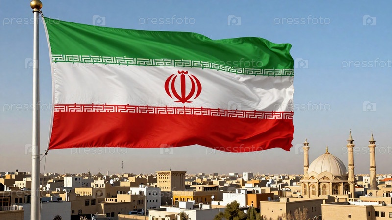 Ветром над городской сценой движется иранский флаг. На горизонте видны здания и мечеть. Солнечный день в Иране Generative AI