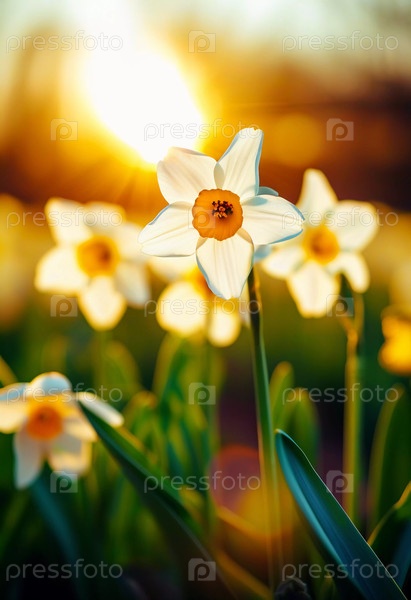 Цветы нарцисса заполняют клумбу яркими лепестками, когда солнце садится на задний план.Теплый свет подчеркивает цветы и улучшает вид на сад Генеративный ИИ