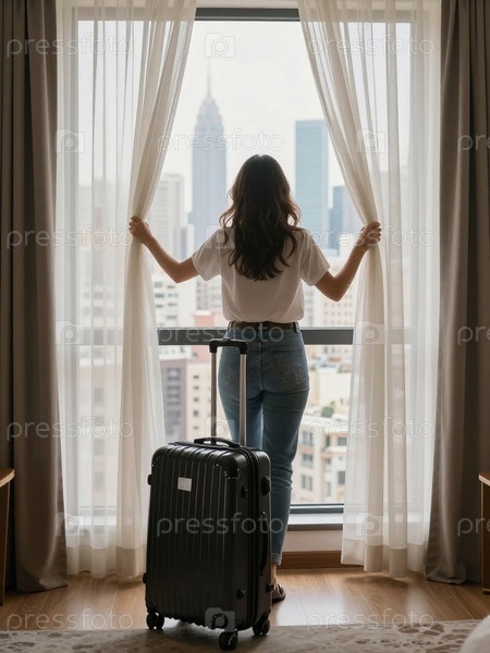 Женщина стоит в гостиничном номере и смотрит из окна на высокие здания. Она держит шторы в сторону, а чемодан расположен рядом с ней