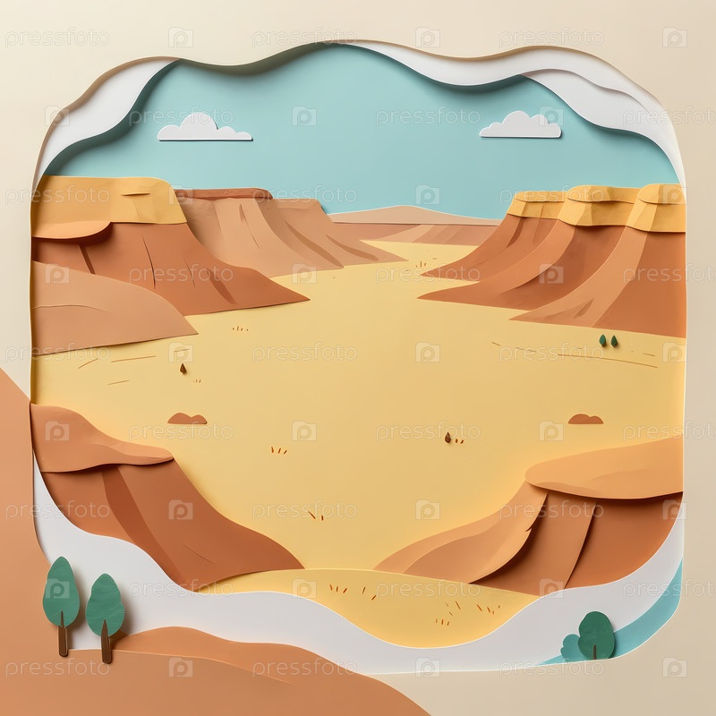 Огромная пустынная прерия показывает желтый песчаный пейзаж с холмами по обе стороны и чистым голубым небом выше.Простые деревья разбросаны на переднем плане Generative AI