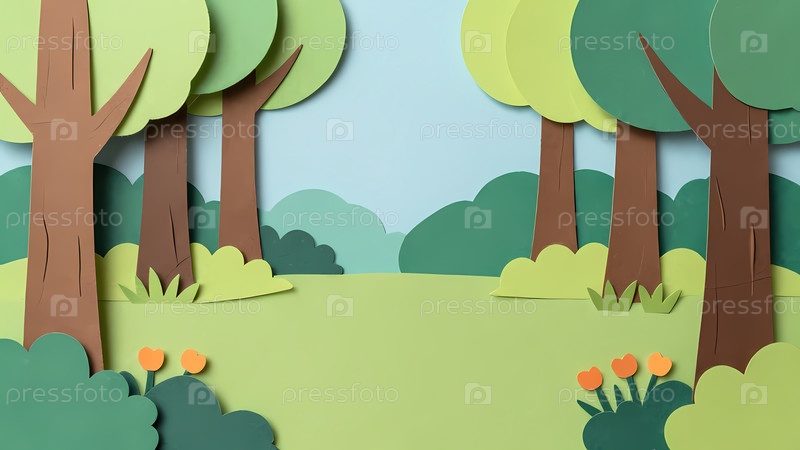 В летней сцене фон заполняют бумажные деревья и зеленые кустарники.Земля зелёная с простыми цветками оранжевого и желтого цвета.Этот пейзаж показывает яркую и красочную обстановку Generative AI