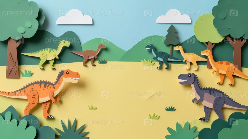 Модели динозавров собираются в бумажном ландшафте, наполненном деревьями и красочными холмами.Они стоят неподвижно, создавая игривую сцену в яркой обстановке Generative AI