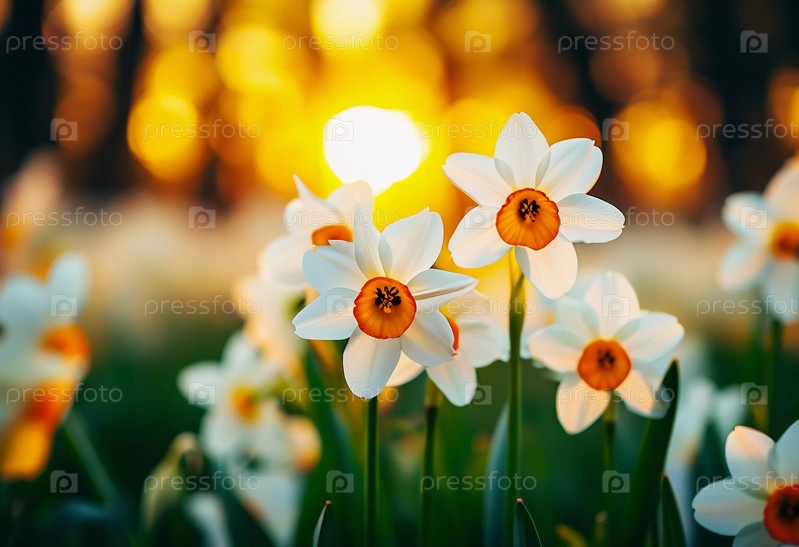 Цветы нарцисса стоят высоко в клумбе при закате солнца, создавая теплый и красочный фон.Цветки демонстрируют белые листья и яркий центр Generative AI
