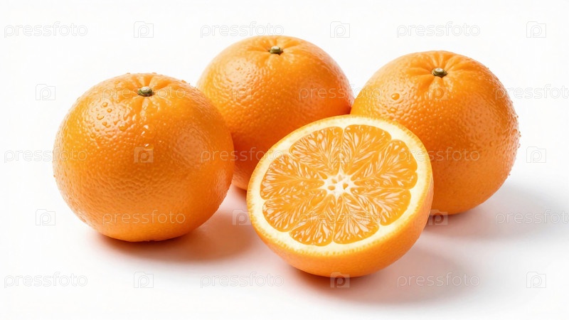 Оранжи размещаются на белой поверхности. Один апельсин разрезают пополам, чтобы показать его внутреннюю часть. Кожа яркая и текстурированная. Настройка простая и сосредоточена на фруктах Generative AI