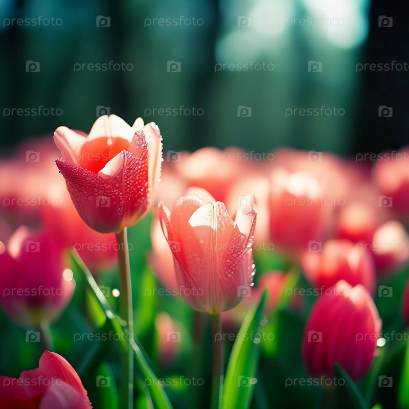 Сад, наполненный розовыми и красными тюльпанами стоит высоко в ярком утреннем свете. капли росы блестят на листьях. солнечный свет фильтрует через деревья, улучшая красоту цветов Generative AI