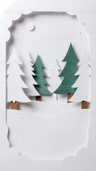 На дисплее изображено несколько елк, сделанных из бумаги.Деревья имеют разные оттенки зеленого и белого цвета.Простая луна и снежный пол завершают сцену Generative AI