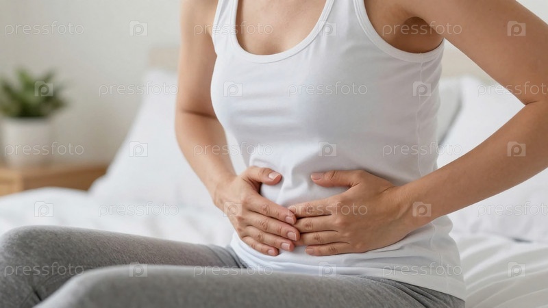 Женщина сидит на своей кровати, держит свой живот обеими руками. Ей кажется, что у нее болит из-за менструальных спазмов и метеоризма. Это день, и она выглядит неудобно Generative AI
