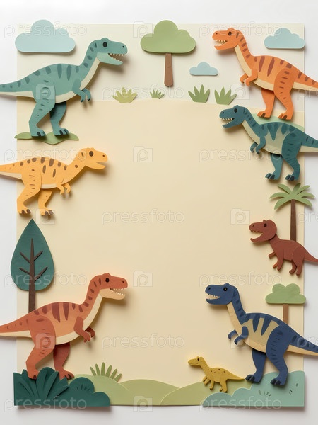 Динозавры находятся в различных позах, окруженные деревьями и растениями, создавая увлекательную сцену Generative AI