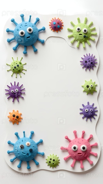 Яркие фигуры бактерий и коронавирусов из пластилина расположены на белом фоне.Они отображаются вокруг пустого пространства, предназначенного для текста или других деталей Generative AI