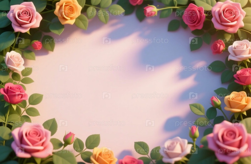 Розы в оттенках розового, желтого и белого окружают пустую область.Освещение создает мягкие тени, делая сцену яркой и привлекательной для генеративного ИИ