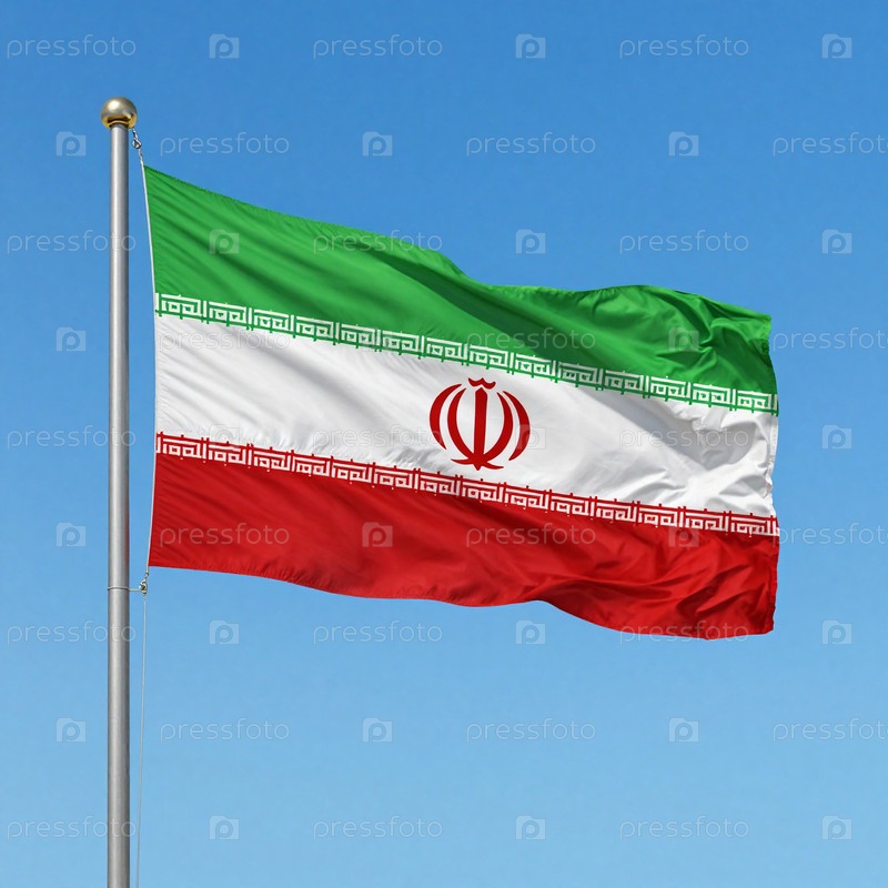 Флаг Ирана развевается на флагштоке против чистого синего неба. цвета зеленый, белый и красный расположены в горизонтальных полосах с символом посередине Генеративная AI