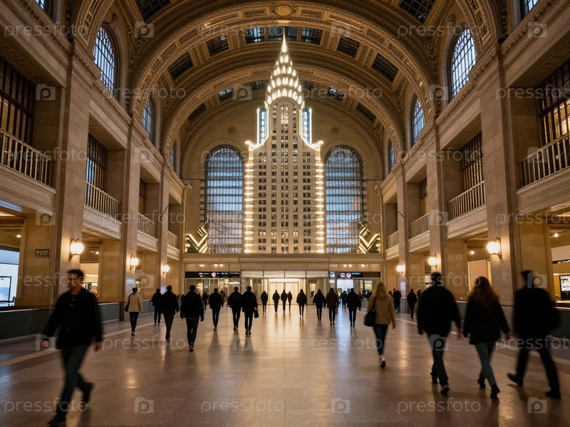 Толпы пассажиров перемещаются через железнодорожный вокзал в сторону главного зала.Иконичное здание загорается, когда люди приходят и уезжают вечером Generative AI