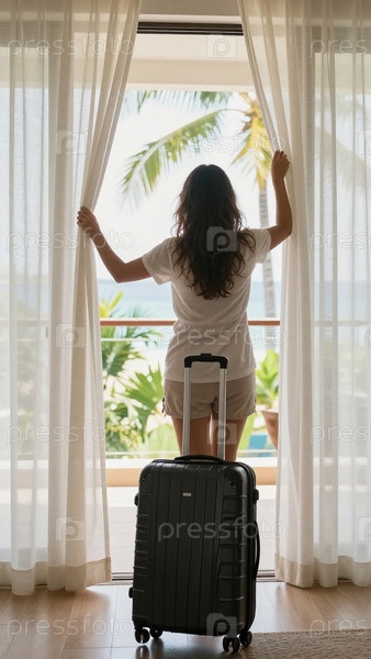 Женщина в гостиничном номере открывает шторы, чтобы посмотреть на пляж.Она стоит с чемоданом рядом и готовится к дню у моря Генеративный ИИ