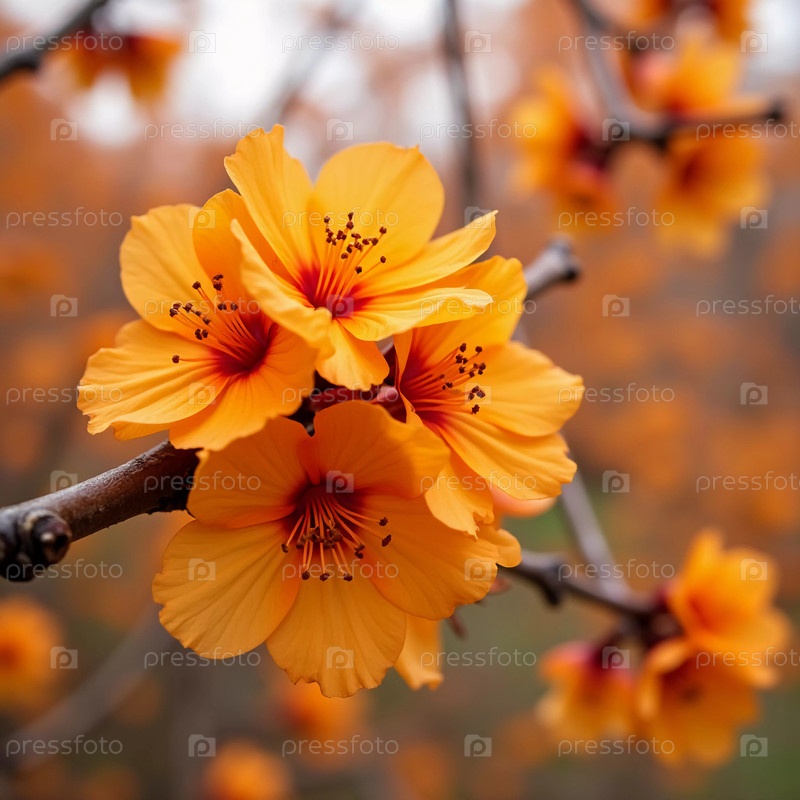 Оранжевые цветы растут на ветках в саду. Они выделяются на фоне большего количества оранжевых цветков. Солнце светит яркими листьями днем Generative AI