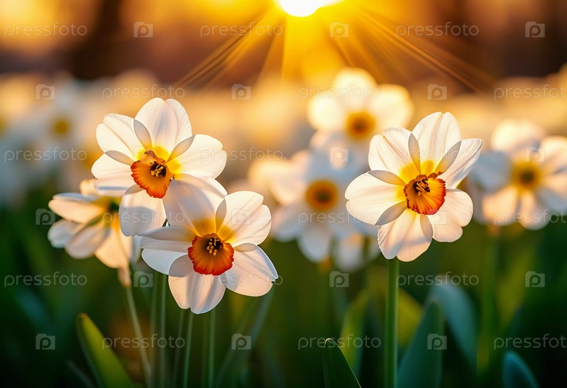 Группа цветов нарцисса стоит в клумбе, когда солнце садится на задний план и освещает сад теплым светом.Цветы показывают свои белые листья с оранжевыми центрами Generative AI