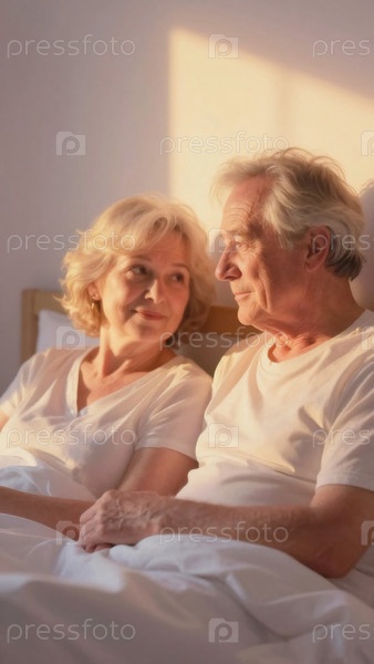 Пожилая пара сидит вместе в постели, наслаждаясь солнечным утром.Они смотрят друг на друга с улыбкой, делясь моментом счастья в своем браке Generative AI
