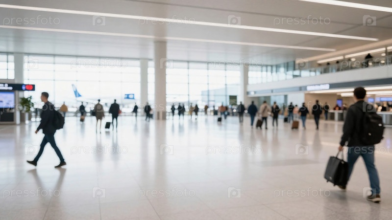 Путешественники проходят через оживленный терминал аэропорта, неся чемоданы и направляясь к разным воротам рейса