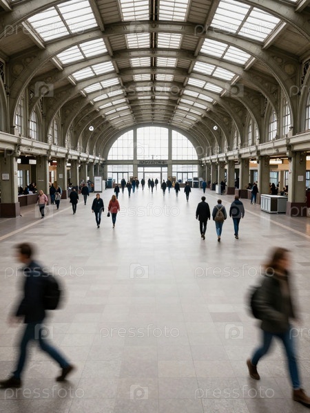 Толпы людей проходят через оживленный железнодорожный вокзал. Пассажиры и туристы спешат по тротуару. Большие окна впускают дневной свет, создавая шумную сцену Generative AI
