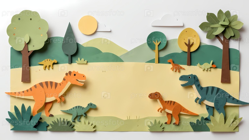 Коллекция бумажных динозавров показана в ландшафте, сделанном из вырезов на бумаге.Различные деревья и солнце делают сцену красочной, яркой и игривой Generative AI