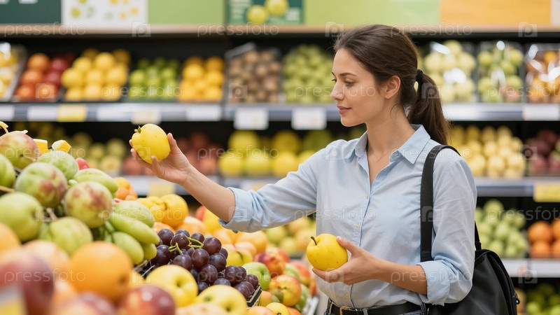 Женщина находится в продуктовом магазине, выбирая фрукты и овощи.Она держит желтые яблоки одной рукой и исследует зеленые с другой.Она выглядит сосредоточенной на своей задаче Генеративный ИИ