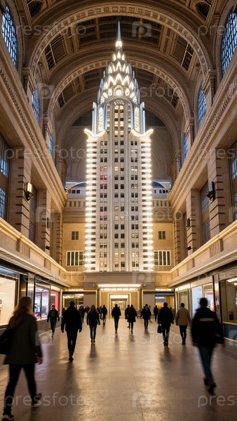 Пассажиры перемещаются по оживленной железнодорожной станции, а туристы оглядываются вокруг.Сцена фиксирует активность и энергию людей, прибывающих и уходящих, особенно ночью Generative AI
