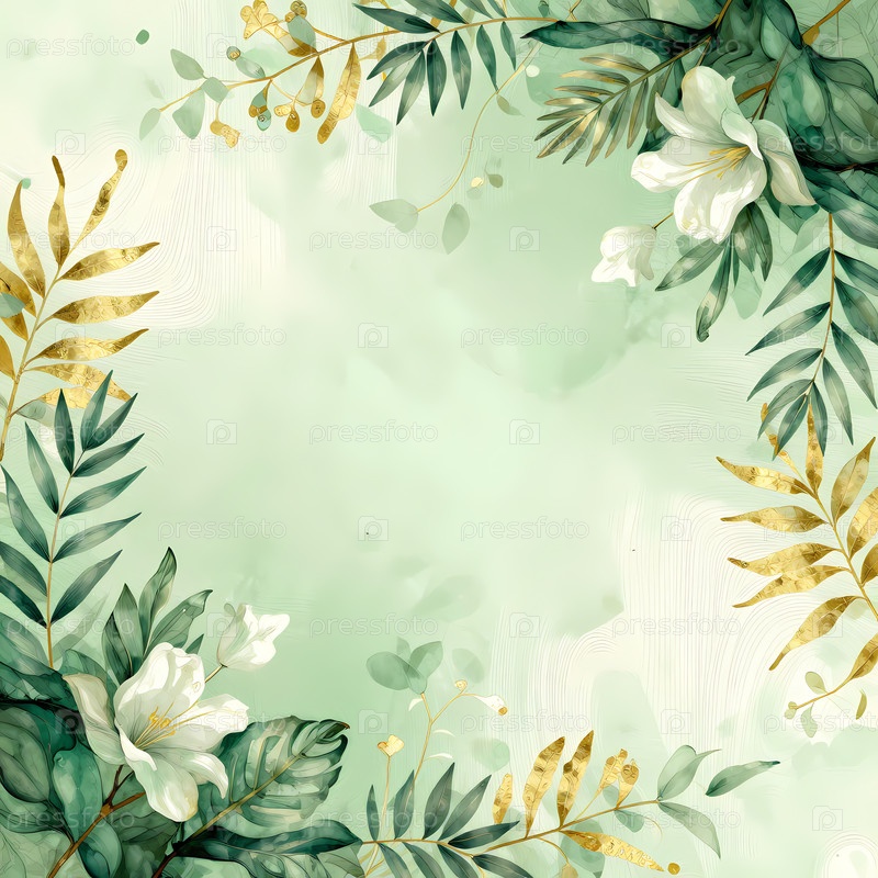 Зеленый фон, наполненный белыми цветами и различными листьями. Его можно использовать для приглашений, открыток или других дизайнерских проектов. Простая компоновка предлагает свежий внешний вид Generative AI