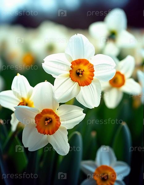 Цветки нарцисса цветут в клумбе, поскольку они захватывают свет весеннего солнца.Эти цвета демонстрируют белые листья с оранжевым центром, привлекая внимание прохожих Generative AI