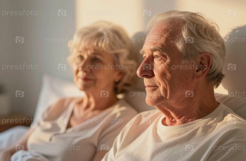 Пожилая пара сидит вместе в постели, наслаждаясь солнечным утренним светом.Они улыбаются и смотрят друг на друга с теплотой, размышляя о своих годах брака и дружбы Generative AI