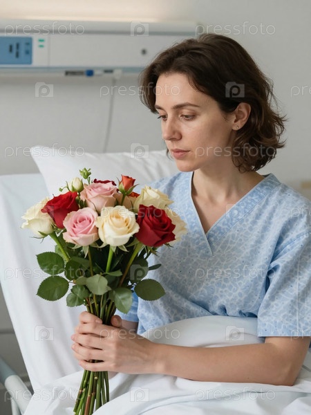 Женщина в больничном отделении сидит на кровати и держит букет цветов. она смотрит на цветки с серьезным выражением лица, размышляя о своем здоровье