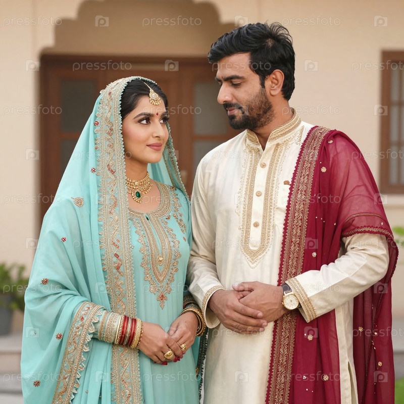Мужчина и женщина, одетые в традиционную индийскую одежду, смотрят друг на друга с улыбкой.Они стоят в обычной обстановке дома во время праздничного мероприятия Generative AI