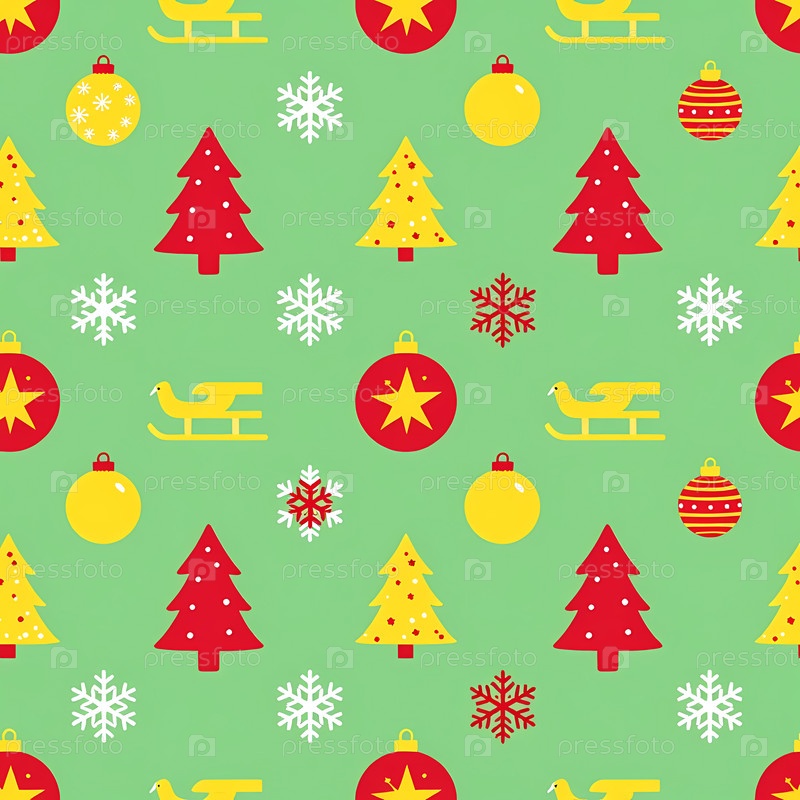 Эта оберточная бумага показывает дизайн с рождественскими и новогодними предметами, такими как деревья, украшения, снежинки и сани, расположенные в повторяющемся узоре на зеленом генеративном ИИ