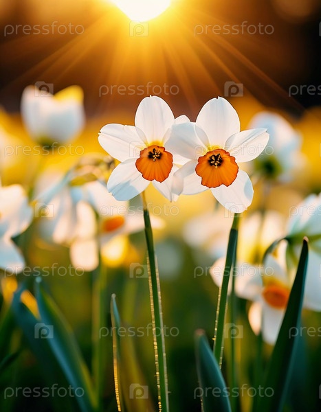 Два цветка нарцисса стоят высоко в клумбе при восходе солнца, создавая теплое свечение вокруг них в саду.Окружающие цветы дополняют красочную сцену Generative AI