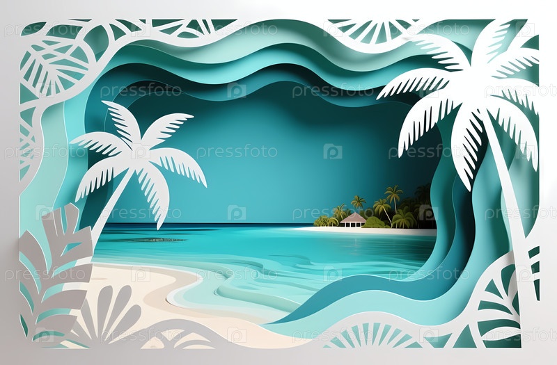 Пляжная сцена с волнами и пальмами. на заднем плане небольшой дом сидит на берегу. светлые цвета заполняют пространство чувством лета генеративный AI