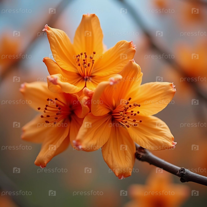 В солнечном саду ярко-оранжевые цветы демонстрируют свои яркие листья, когда они распускаются на ветках.Птицы песчат поблизости, придавая жизнь сцене посреди утра Generative AI