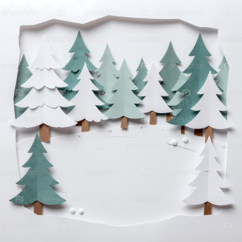 Бумажные деревья в разных оттенках расположены так, чтобы создать зимний ландшафт пихты и елки. белый фон улучшает дизайн бумажного ремесла Generative AI