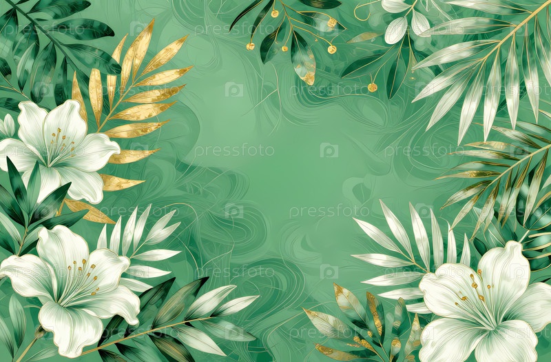 Белые цветы с зелеными листьями заполняют уголки пространства. Яркий зеленый фон создает яркую обстановку