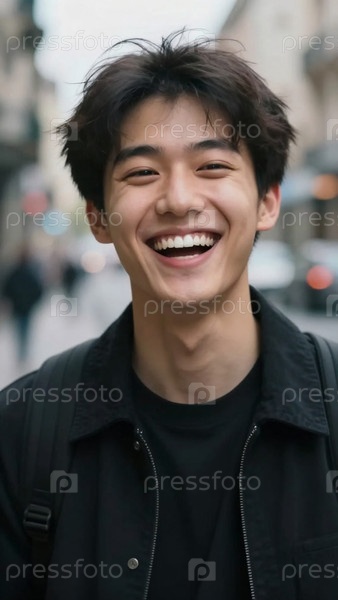 Молодой человек гуляет по городу. Он улыбается и выглядит счастливо. Улицы переполнены людьми, а на заднем плане здания. На улице светлое время суток Generative AI