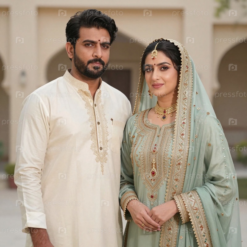 Индийская пара позирует вместе в традиционных нарядах. Мужчина носит куртку, а женщина - украшенный костюм с дупатом. Они выглядят счастливыми и помолвленными друг с другом Generative AI