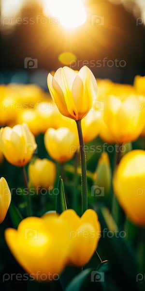 Желтые тюльпаны стоят высоко в саду, наполненном цветами. Солнце сияет ярко, освещая листья. Наступила весна и цветы создают красочную сцену Generative AI