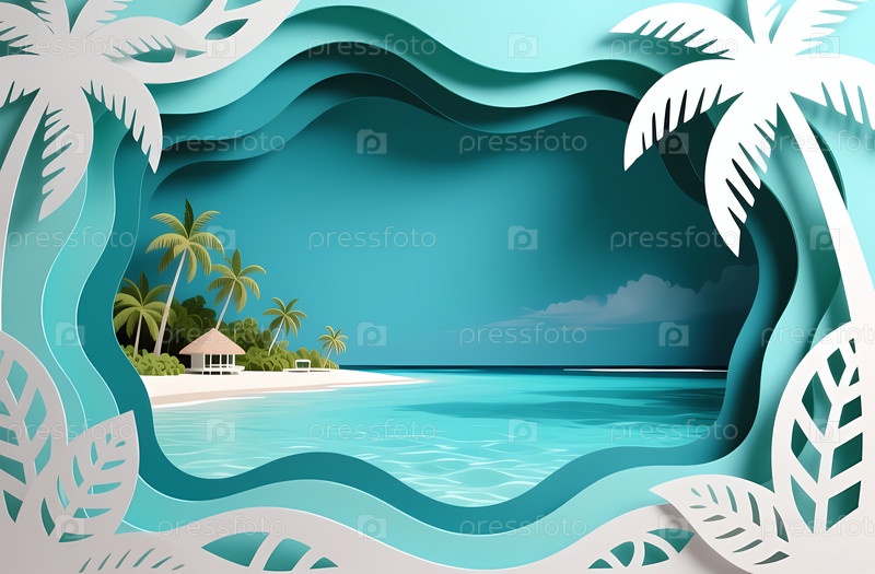 Пляжная сцена показывает спокойные океанские волны, пальмы и хижину под ярким небом.Эта обстановка приглашает на веселье у моря, идеально подходит для летнего отдыха Generative AI