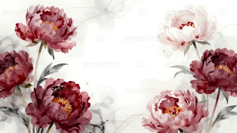 Пеонины в красно-бургундских и белых цветах размещаются вместе с зелеными листьями.Фон светлый и яркий, показывая цветы четко Generative AI