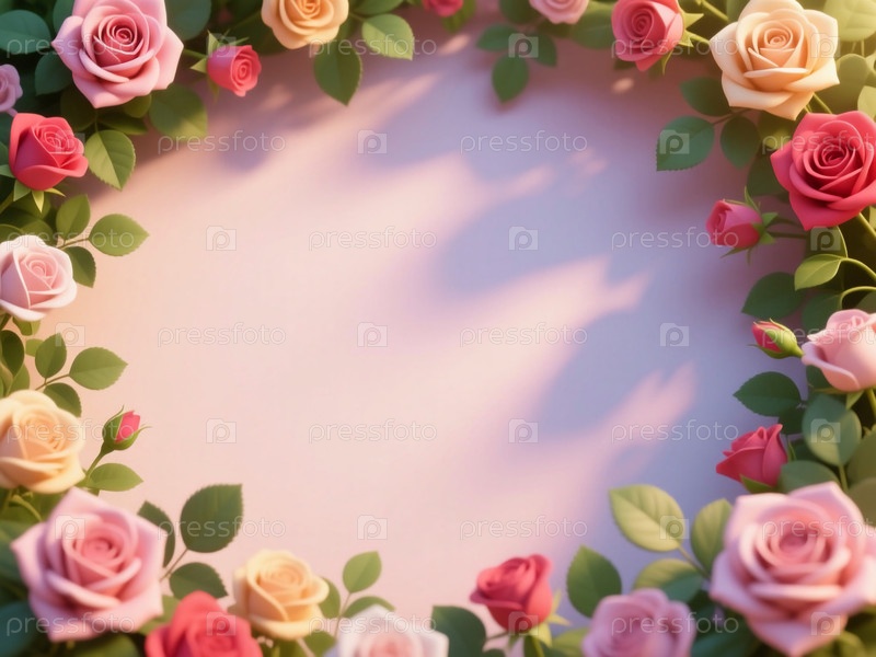 Цветные розы образуют рамку вокруг пустой области.Цветы имеют оттенки розового и красного цветов.Эта установка может быть использована для записи или украшения различных мероприятий Generative AI