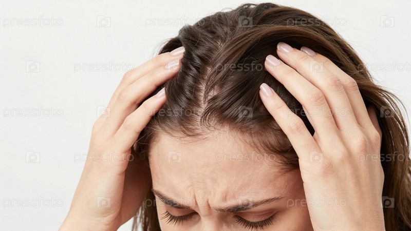 Женщина держит голову обеими руками, показывая беспокойство по поводу своих волос.Она выглядит обеспокоенной, когда смотрит вниз, что указывает на значительную проблему с волосами во внутреннем пространстве Generative AI